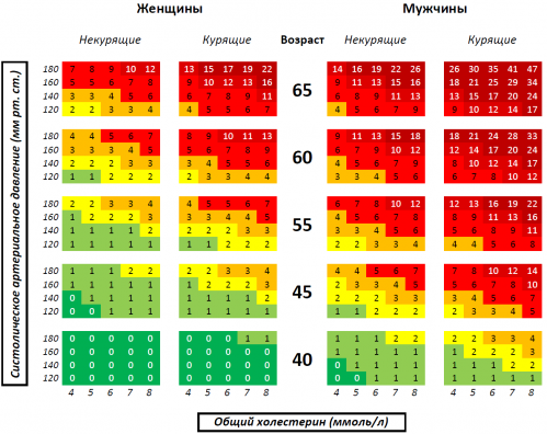 А цифры означают вероятность в процентах серьезного сердечно-сосудистого события в течение года (инфаркт, инсульт, госпитализация по поводу сердечной болезни...).
